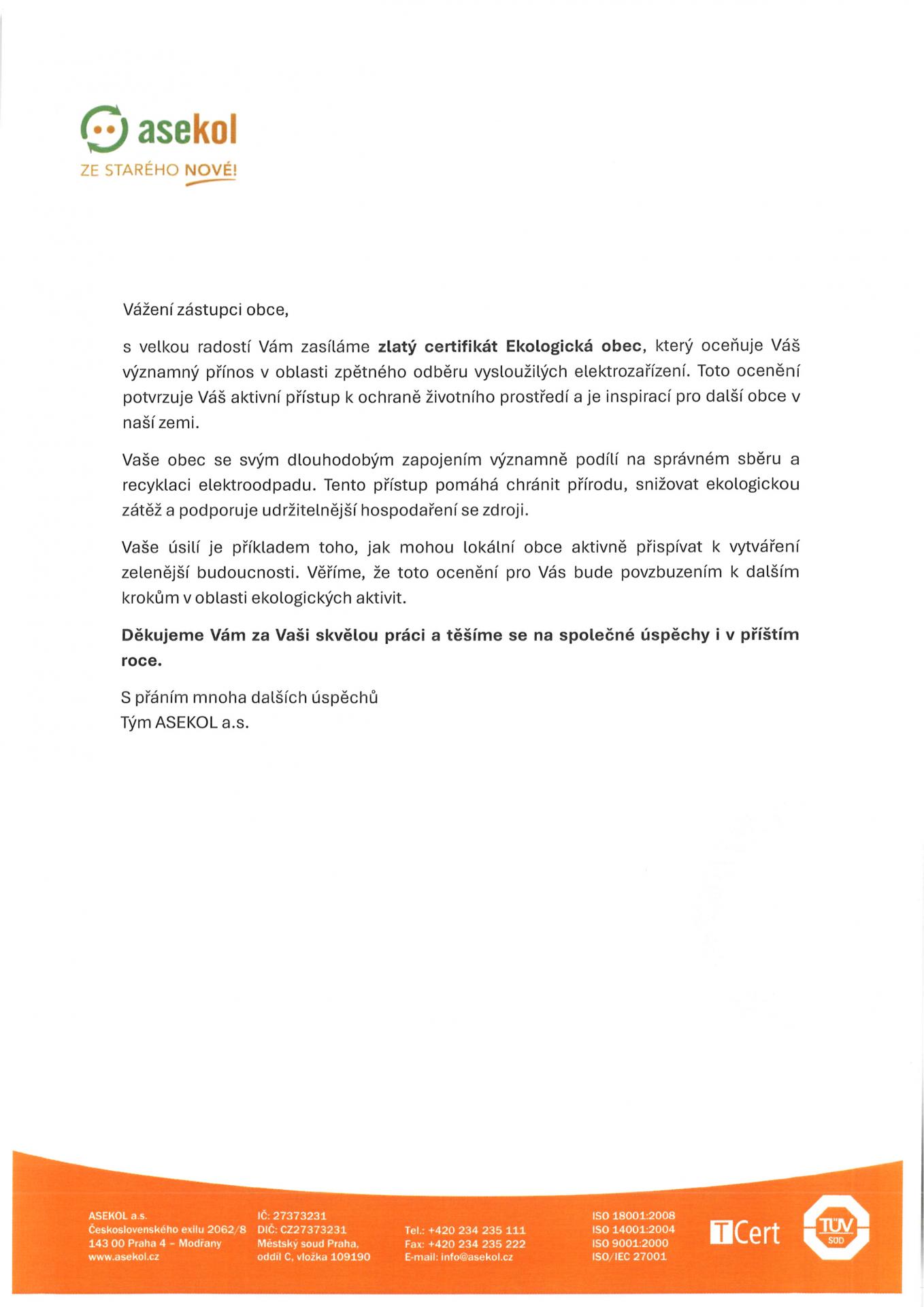 Obdrželi jsme další ocenění za zpětný odběr vysloužilých elektrozařízení a to ZLATÝ CERTIFIKÁT EKOLOGICKÁ OBEC.