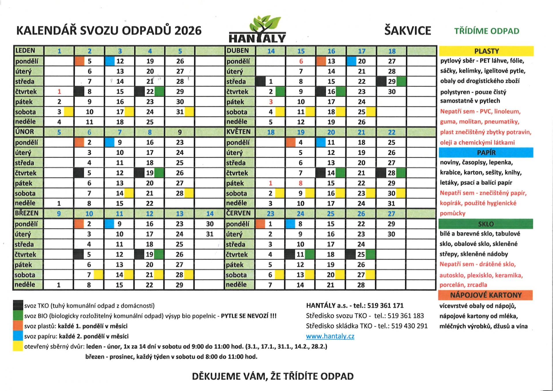 Každé 1. pondělí v měsíci - svoz plastů (plast musí být sešlápnutý).